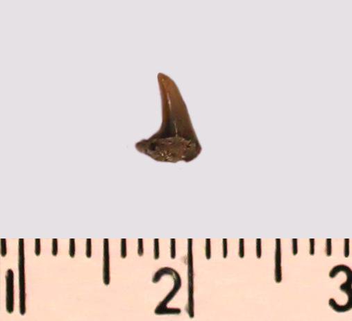Зуб (фрагмент). Акула. Odontaspis striatula Dalinkevicius, 1935. Классификация: Хордовые Chordata, Позвоночные Vertebrata, Хрящевые рыбы Chondrichthyes, Пластиножаберные Elasmobranchii, Акулы Selachii, Ламнообразные Lamniformes