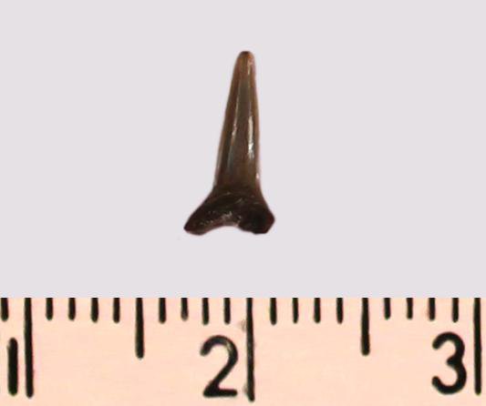 Зуб (фрагмент). Акула. Odontaspis striatula Dalinkevicius, 1935. Классификация: Хордовые Chordata, Позвоночные Vertebrata, Хрящевые рыбы Chondrichthyes, Пластиножаберные Elasmobranchii, Акулы Selachii, Ламнообразные Lamniformes