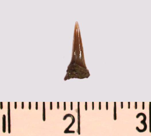 Зуб (фрагмент). Акула. Odontaspis striatula Dalinkevicius, 1935. Классификация: Хордовые Chordata, Позвоночные Vertebrata, Хрящевые рыбы Chondrichthyes, Пластиножаберные Elasmobranchii, Акулы Selachii, Ламнообразные Lamniformes