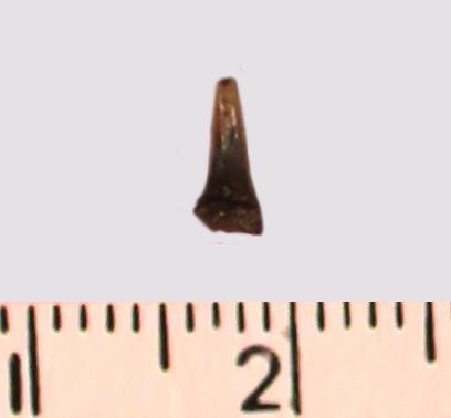 Зуб (фрагмент). Акула. Odontaspis striatula Dalinkevicius, 1935. Классификация: Хордовые Chordata, Позвоночные Vertebrata, Хрящевые рыбы Chondrichthyes, Пластиножаберные Elasmobranchii, Акулы Selachii, Ламнообразные Lamniformes