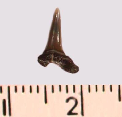 Зуб. Акула. Odontaspis striatula Dalinkevicius, 1935. Классификация: Хордовые Chordata, Позвоночные Vertebrata, Хрящевые рыбы Chondrichthyes, Пластиножаберные Elasmobranchii, Акулы Selachii, Ламнообразные Lamniformes