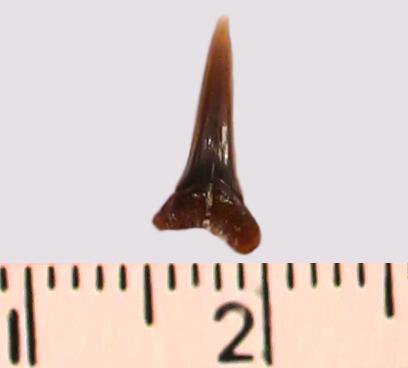 Зуб. Акула. Odontaspis striatula Dalinkevicius, 1935. Классификация: Хордовые Chordata, Позвоночные Vertebrata, Хрящевые рыбы Chondrichthyes, Пластиножаберные Elasmobranchii, Акулы Selachii, Ламнообразные Lamniformes