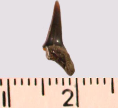 Зуб. Акула. Odontaspis striatula Dalinkevicius, 1935. Классификация: Хордовые Chordata, Позвоночные Vertebrata, Хрящевые рыбы Chondrichthyes, Пластиножаберные Elasmobranchii, Акулы Selachii, Ламнообразные Lamniformes
