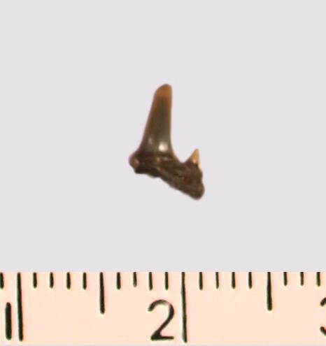 Зуб. Акула. Odontaspis striatula Dalinkevicius, 1935. Классификация: Хордовые Chordata, Позвоночные Vertebrata, Хрящевые рыбы Chondrichthyes, Пластиножаберные Elasmobranchii, Акулы Selachii, Ламнообразные Lamniformes