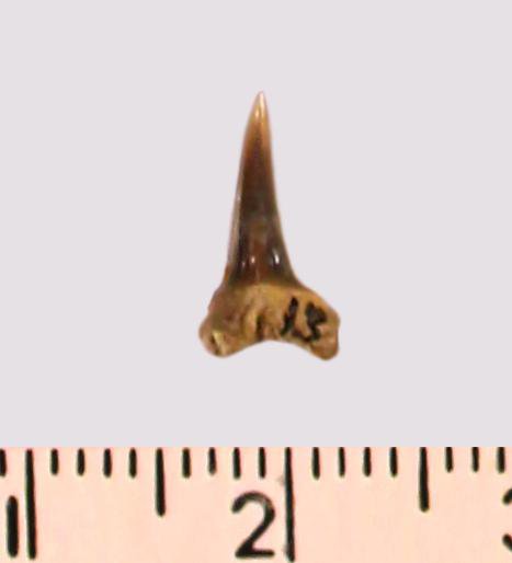 Зуб. Акула. Odontaspis striatula Dalinkevicius, 1935. Классификация: Хордовые Chordata, Позвоночные Vertebrata, Хрящевые рыбы Chondrichthyes, Пластиножаберные Elasmobranchii, Акулы Selachii, Ламнообразные Lamniformes