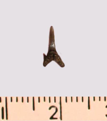 Зуб. Акула. Odontaspis striatula Dalinkevicius, 1935. Классификация: Хордовые Chordata, Позвоночные Vertebrata, Хрящевые рыбы Chondrichthyes, Пластиножаберные Elasmobranchii, Акулы Selachii, Ламнообразные Lamniformes