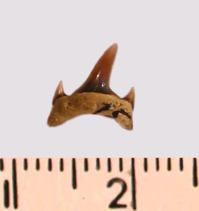 Зуб. Акула. Odontaspis striatula Dalinkevicius, 1935. Классификация: Хордовые Chordata, Позвоночные Vertebrata, Хрящевые рыбы Chondrichthyes, Пластиножаберные Elasmobranchii, Акулы Selachii, Ламнообразные Lamniformes