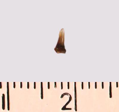 Зуб (фрагмент). Акула. Squatina cranei (Woodward, 1888). Классификация: Хордовые Chordata, Позвоночные Vertebrata, Хрящевые рыбы Chondrichthyes, Пластиножаберные Elasmobranchii, Акулы Selachii, Скватинообразные Squatiniformes