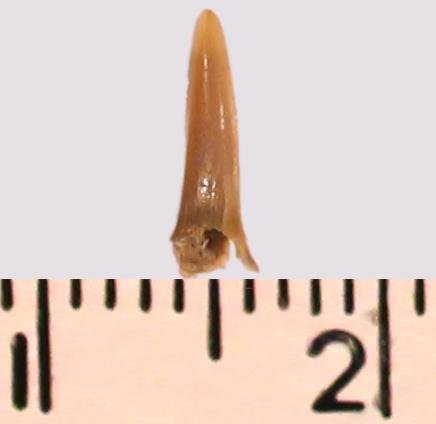Зуб (фрагмент). Акула. Odontaspis subulata (Agassiz, 1843). Классификация: Хордовые Chordata, Позвоночные Vertebrata, Хрящевые рыбы Chondrichthyes, Пластиножаберные Elasmobranchii, Акулы Selachii, Ламнообразные Lamniformes