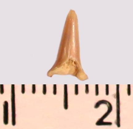 Зуб (фрагмент). Акула. Odontaspis subulata (Agassiz, 1843). Классификация: Хордовые Chordata, Позвоночные Vertebrata, Хрящевые рыбы Chondrichthyes, Пластиножаберные Elasmobranchii, Акулы Selachii, Ламнообразные Lamniformes
