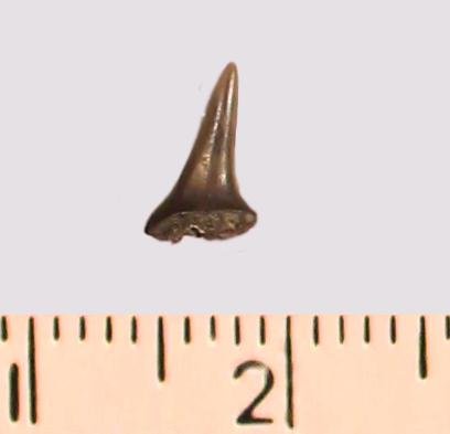 Зуб (фрагмент). Акула. Odontaspis subulata (Agassiz, 1843). Классификация: Хордовые Chordata, Позвоночные Vertebrata, Хрящевые рыбы Chondrichthyes, Пластиножаберные Elasmobranchii, Акулы Selachii, Ламнообразные Lamniformes