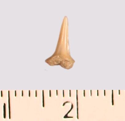 Зуб (фрагмент). Акула. Odontaspis subulata (Agassiz, 1843). Классификация: Хордовые Chordata, Позвоночные Vertebrata, Хрящевые рыбы Chondrichthyes, Пластиножаберные Elasmobranchii, Акулы Selachii, Ламнообразные Lamniformes