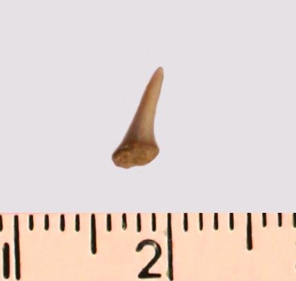 Зуб (фрагмент). Акула. Odontaspis subulata (Agassiz, 1843). Классификация: Хордовые Chordata, Позвоночные Vertebrata, Хрящевые рыбы Chondrichthyes, Пластиножаберные Elasmobranchii, Акулы Selachii, Ламнообразные Lamniformes