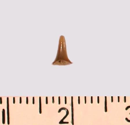 Зуб (фрагмент). Акула. Odontaspis subulata (Agassiz, 1843). Классификация: Хордовые Chordata, Позвоночные Vertebrata, Хрящевые рыбы Chondrichthyes, Пластиножаберные Elasmobranchii, Акулы Selachii, Ламнообразные Lamniformes