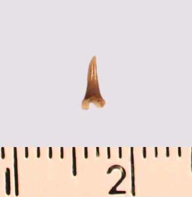 Зуб (фрагмент). Акула. Odontaspis subulata (Agassiz, 1843). Классификация: Хордовые Chordata, Позвоночные Vertebrata, Хрящевые рыбы Chondrichthyes, Пластиножаберные Elasmobranchii, Акулы Selachii, Ламнообразные Lamniformes