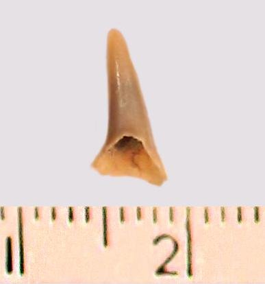 Зуб (фрагмент). Акула. Odontaspis macrorhiza (Cope) Leriche, 1902. Классификация: Хордовые Chordata, Позвоночные Vertebrata, Хрящевые рыбы Chondrichthyes, Пластиножаберные Elasmobranchii, Акулы Selachii, Ламнообразные Lamniformes