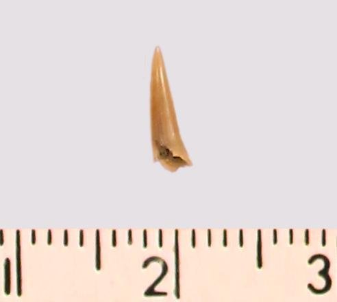 Зуб (фрагмент). Акула. Odontaspis subulata (Agassiz, 1843). Классификация: Хордовые Chordata, Позвоночные Vertebrata, Хрящевые рыбы Chondrichthyes, Пластиножаберные Elasmobranchii, Акулы Selachii, Ламнообразные Lamniformes