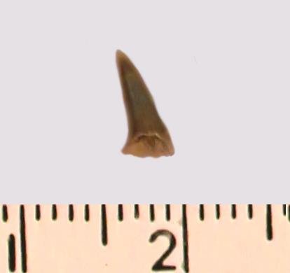 Зуб (фрагмент). Акула. Odontaspis subulata (Agassiz, 1843). Классификация: Хордовые Chordata, Позвоночные Vertebrata, Хрящевые рыбы Chondrichthyes, Пластиножаберные Elasmobranchii, Акулы Selachii, Ламнообразные Lamniformes