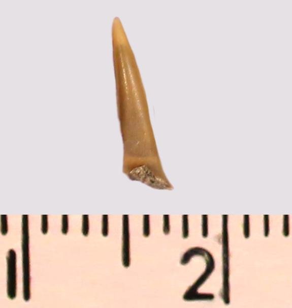 Зуб (фрагмент). Акула. Odontaspis subulata (Agassiz, 1843). Классификация: Хордовые Chordata, Позвоночные Vertebrata, Хрящевые рыбы Chondrichthyes, Пластиножаберные Elasmobranchii, Акулы Selachii, Ламнообразные Lamniformes