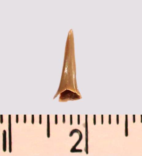 Зуб (фрагмент). Акула. Odontaspis subulata (Agassiz, 1843). Классификация: Хордовые Chordata, Позвоночные Vertebrata, Хрящевые рыбы Chondrichthyes, Пластиножаберные Elasmobranchii