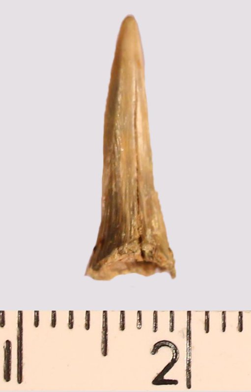 Зуб (фрагмент). Акула. Scapanorhynchus cf. raphiodon (Agassiz, 1843). Классификация: Хордовые Chordata, Позвоночные Vertebrata, Хрящевые рыбы Chondrichthyes, Пластиножаберные Elasmobranchii