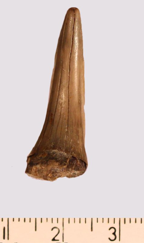 Зуб (фрагмент). Акула. Scapanorhynchus cf. raphiodon (Agassiz, 1843). Классификация: Хордовые Chordata, Позвоночные Vertebrata, Хрящевые рыбы Chondrichthyes, Пластиножаберные Elasmobranchii
