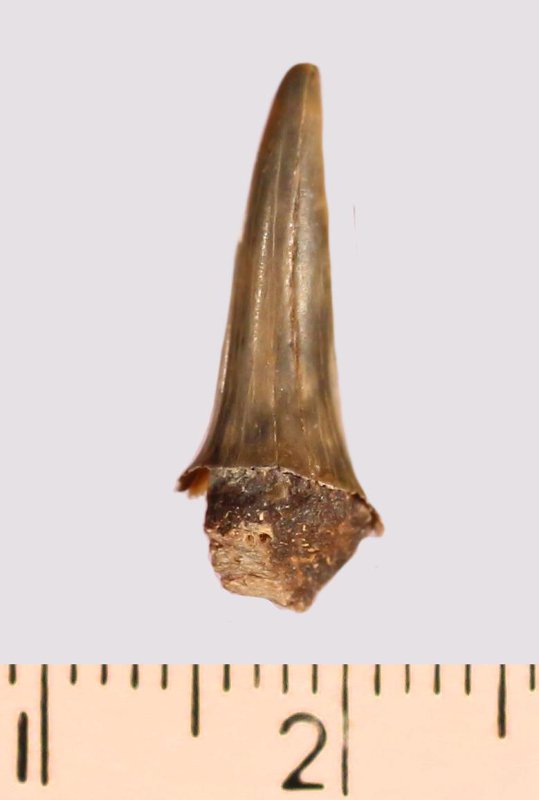 Зуб (фрагмент). Акула. Scapanorhynchus cf. raphiodon (Agassiz, 1843). Классификация: Хордовые Chordata, Позвоночные Vertebrata, Хрящевые рыбы Chondrichthyes, Пластиножаберные Elasmobranchii