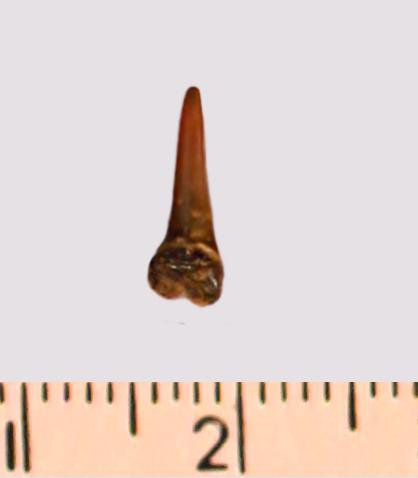 Зуб (фрагмент). Акула. Odontaspis subulata (Agassiz, 1843). Классификация: Хордовые Chordata, Позвоночные Vertebrata, Хрящевые рыбы Chondrichthyes, Пластиножаберные Elasmobranchii