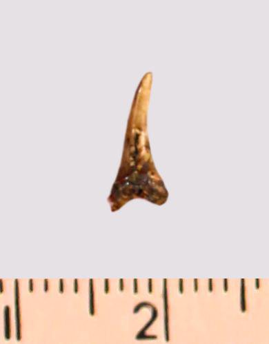 Зуб (фрагмент). Акула. Odontaspis subulata (Agassiz, 1843). Классификация: Хордовые Chordata, Позвоночные Vertebrata, Хрящевые рыбы Chondrichthyes, Пластиножаберные Elasmobranchii