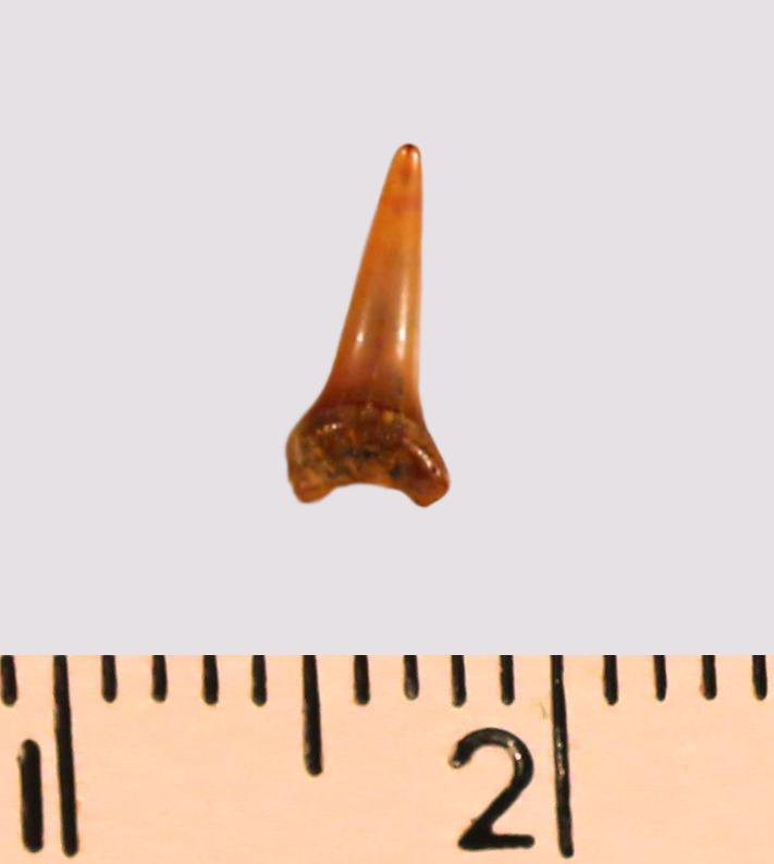 Зуб (фрагмент). Акула. Odontaspis subulata (Agassiz, 1843). Классификация: Хордовые Chordata, Позвоночные Vertebrata, Хрящевые рыбы Chondrichthyes, Пластиножаберные Elasmobranchii