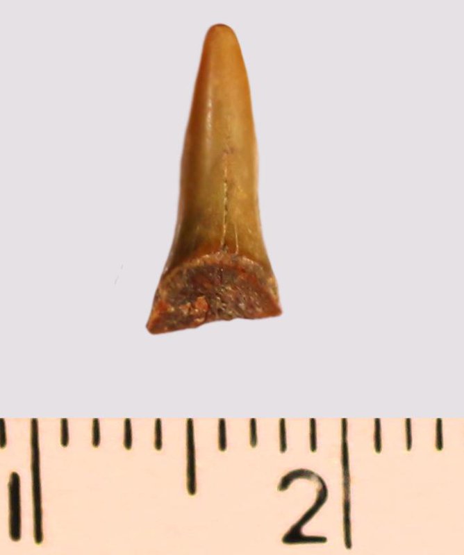 Зуб (фрагмент). Акула. Odontaspis macrorhiza (Cope) Leriche, 1902. Классификация: Хордовые Chordata, Позвоночные Vertebrata, Хрящевые рыбы Chondrichthyes, Пластиножаберные Elasmobranchii
