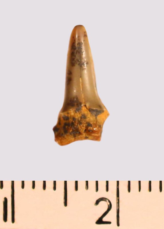 Зуб (фрагмент). Акула. Odontaspis macrorhiza (Cope) Leriche, 1902. Классификация: Хордовые Chordata, Позвоночные Vertebrata, Хрящевые рыбы Chondrichthyes, Пластиножаберные Elasmobranchii