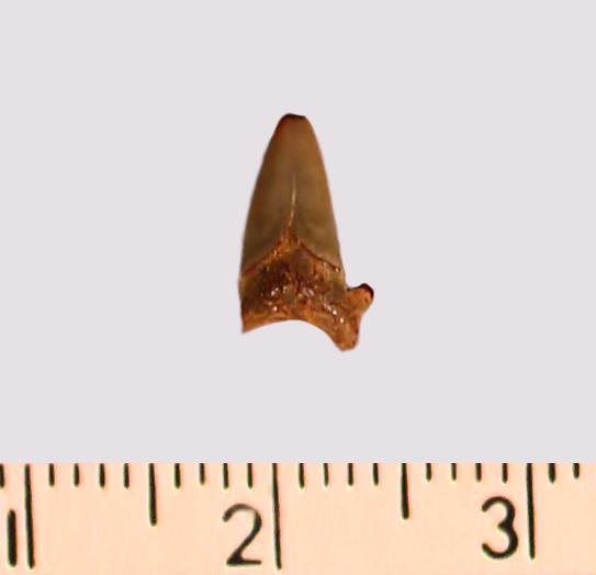 Зуб (фрагмент). Акула. Odontaspis macrorhiza (Cope) Leriche, 1902. Классификация: Хордовые Chordata, Позвоночные Vertebrata, Хрящевые рыбы Chondrichthyes, Пластиножаберные Elasmobranchii