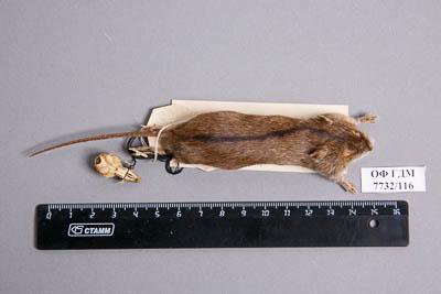 Тушка с черепом. Полевая мышь. Apodemus agrarius Pallas,1771. Классификация: Хордовые Chordata, Позвоночные Vertebrata, Млекопитающие Mammalia, Грызуны Rodentia, Muridae, Полевая мышь Apodemus agrarius Pallas,1771