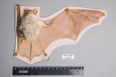 Тушка с черепом. Остроухая ночница. Myotis blythii Tomes,1857. Классификация: Хордовые Chordata, Позвоночные Vertebrata, Млекопитающие Mammalia, Рукокрылые Chiroptera, Гладконосые Vespertilionidae, Остроухая ночница Myotis blythii Tomes,1857