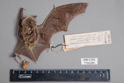 Тушка с черепом. Северный кожанок. Eptesicus nilssoni Keyserling et Blasius,1839. Классификация: Хордовые Chordata, Позвоночные Vertebrata, Млекопитающие Mammalia, Рукокрылые Chiroptera, Гладконосые Vespertilionidae, Северный кожанок Eptesicus nilssoni Keyserling et Blasius,1839