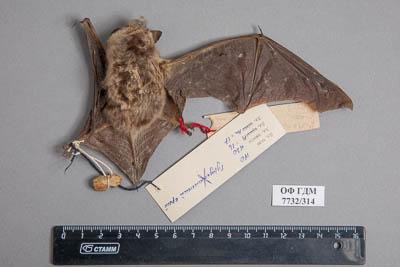 Тушка с черепом. Северный кожанок. Eptesicus nilssoni Keyserling et Blasius,1839. Классификация: Хордовые Chordata, Позвоночные Vertebrata, Млекопитающие Mammalia, Рукокрылые Chiroptera, Гладконосые Vespertilionidae, Северный кожанок Eptesicus nilssoni Keyserling et Blasius,1839