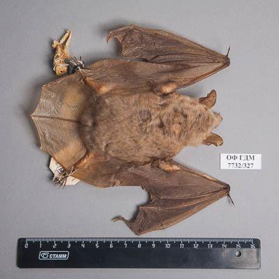 Тушка с черепом. Большая ночница. Myotis myotis Borkhausen,1797. Классификация: Хордовые Chordata, Позвоночные Vertebrata, Млекопитающие Mammalia, Рукокрылые Chiroptera, Гладконосые Vespertilionidae, Большая ночница Myotis myotis Borkhausen,1797