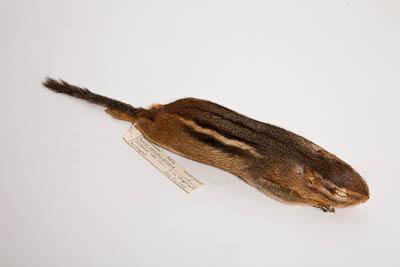 Тушка с черепом. Восточный бурундук. Tamias striatus L.,1758. Классификация: Хордовые Chordata, Позвоночные Vertebrata, Млекопитающие Mammalia, Грызуны Rodentia, Sciuridae, Восточный бурундук Tamias striatus L.,1758