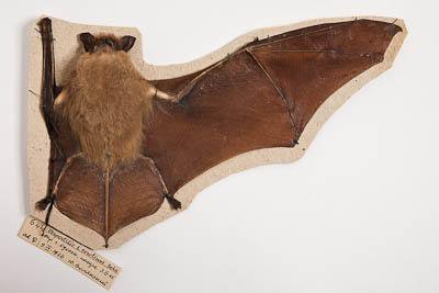 Тушка с черепом. Поздний горный кожан. Eptesicus serotinus Schreber,1774. Классификация: Хордовые Chordata, Позвоночные Vertebrata, Млекопитающие Mammalia, Рукокрылые Chiroptera, Гладконосые Vespertilionidae, Поздний горный кожан Eptesicus serotinus Schreber,1774