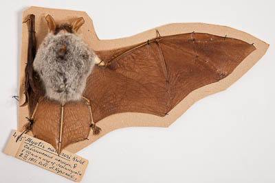Тушка с черепом. Ночница Наттерера. Myotis nattereri Kuhl,1817. Классификация: Хордовые Chordata, Позвоночные Vertebrata, Млекопитающие Mammalia, Рукокрылые Chiroptera, Гладконосые Vespertilionidae, Ночница Наттерера Myotis nattereri Kuhl,1817