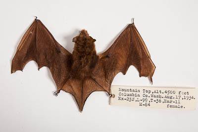 Тушка с черепом. Длинноногая ночница. Myotis volans H.Allen,1866. Классификация: Хордовые Chordata, Позвоночные Vertebrata, Млекопитающие Mammalia, Рукокрылые Chiroptera, Гладконосые Vespertilionidae, Длинноногая ночница Myotis volans H.Allen,1866