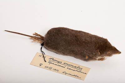 Тушка с черепом. Малая кутора. Neomys anomalus Cabrera,1907. Классификация: Хордовые Chordata, Позвоночные Vertebrata, Млекопитающие Mammalia, Землеройкообразные Soricomorpha, Soricidae, Малая кутора Neomys anomalus Cabrera,1907