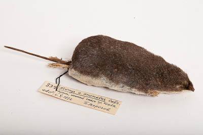Тушка с черепом. Малая кутора. Neomys anomalus Cabrera,1907. Классификация: Хордовые Chordata, Позвоночные Vertebrata, Млекопитающие Mammalia, Землеройкообразные Soricomorpha, Soricidae, Малая кутора Neomys anomalus Cabrera,1907