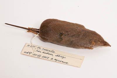 Тушка с черепом. Длиннохвостая белозубка. Crocidura russula Hermann,1780. Классификация: Хордовые Chordata, Позвоночные Vertebrata, Млекопитающие Mammalia, Землеройкообразные Soricomorpha, Soricidae, Длиннохвостая белозубка Crocidura russula Hermann,1780