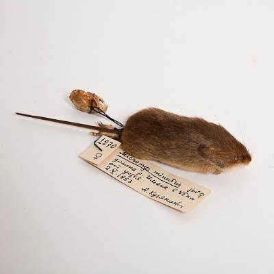 Тушка с черепом. Мышь-малютка. Micromys minutus Pallas,1771. Классификация: Хордовые Chordata, Позвоночные Vertebrata, Млекопитающие Mammalia, Грызуны Rodentia, Muridae, Мышь-малютка Micromys minutus Pallas,1771