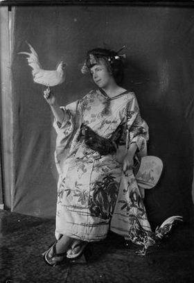 На фотографии изображена Н. Н. Ладыгина-Котс в японском кимоно и гэта. Она смотрит на чучело петуха, которое держит в правой руке. В левой руке держит японский веер. На коленях и справа от неё стоят чучела петухов. Портрет в рост.