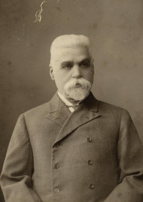 На фотографии изображен В. А. Вагнер. Он в сюртуке и в белой рубашке. Смотрит в сторону. Вид спереди. Портрет поясной.