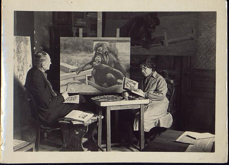 На фотографии изображены К. К. Флеров и Н. Н. Ладыгина - Котс. К. К. Флеров сидит на стуле в черном костюме. В правой руке он держит кисть. Левой рукой он придерживает журнал, лежащий у него на коленях. Вид сбоку. Портрет в полный рост. Справа от него за столом сидит Н. Н. Ладыгина – Котс. В руках она держит книгу, перед ней на столе лежат экспериментальные предметы и палитра. Н. Н. Ладыгина- Котс одета в рабочий халат. Вид сбоку. Портрет в полный рост. На заднем плане видны живописные картины К. К. Флерова, иллюстрирующие эксперименты с орангом. Возле К. К. Флерова на табуретке лежат книги.