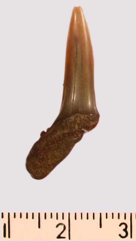 Зуб. Акула. Scapanorhynchus gigas Woodward, 1889. Классификация: Хордовые Chordata, Позвоночные Vertebrata, Хрящевые рыбы Chondrichthyes, Пластиножаберные Elasmobranchii